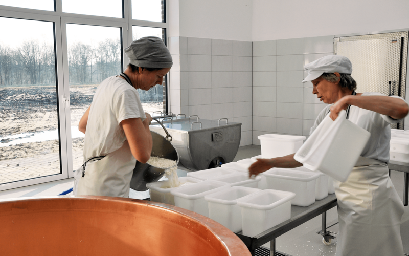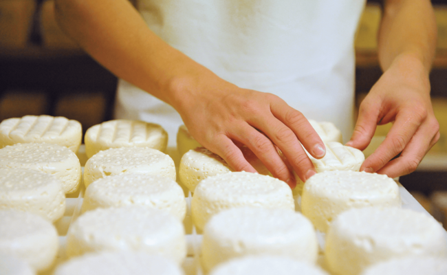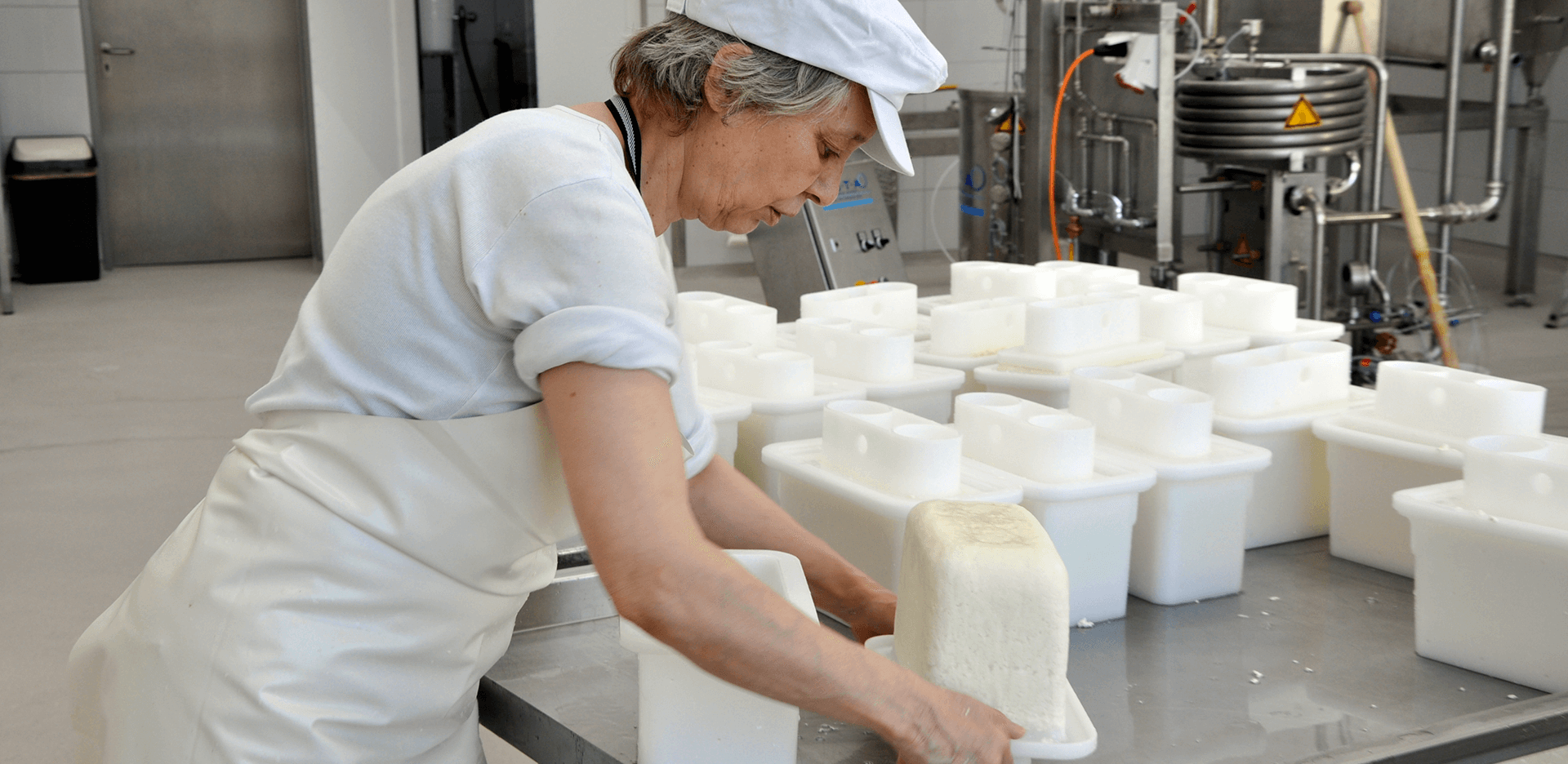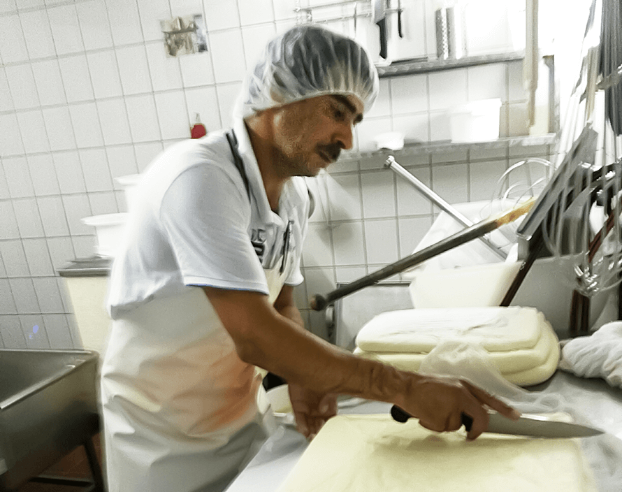 Die meisten Arbeitsschritte werden von Hand durchgeführt: vom Einlaben über die Bruchherstellung mit der Käseharfe bis zum Verschöpfen in die Käseformen. Diese handwerkliche Arbeitsweise erfordert viel Wissen, Geschick und Erfahrung und macht jeden Käselaib zu etwas Besonderem. Von Hand werden die Käselaibe täglich mit Salzwasser gepflegt, wodurch eine natürliche Rinde entsteht. Bei allen unseren Käsesorten kann so auch die Rinde mitgegessen werden. Wir lassen jedem Käse die Zeit die er braucht, bis seine Aromen voll ausgereift sind, je nach Sorte bis zu 10 Monaten. Das schmeckt man!