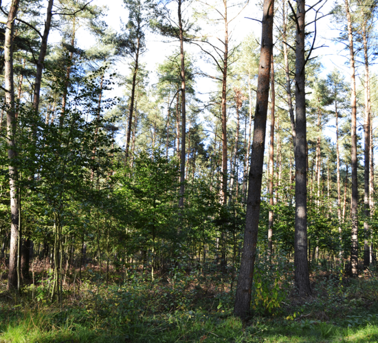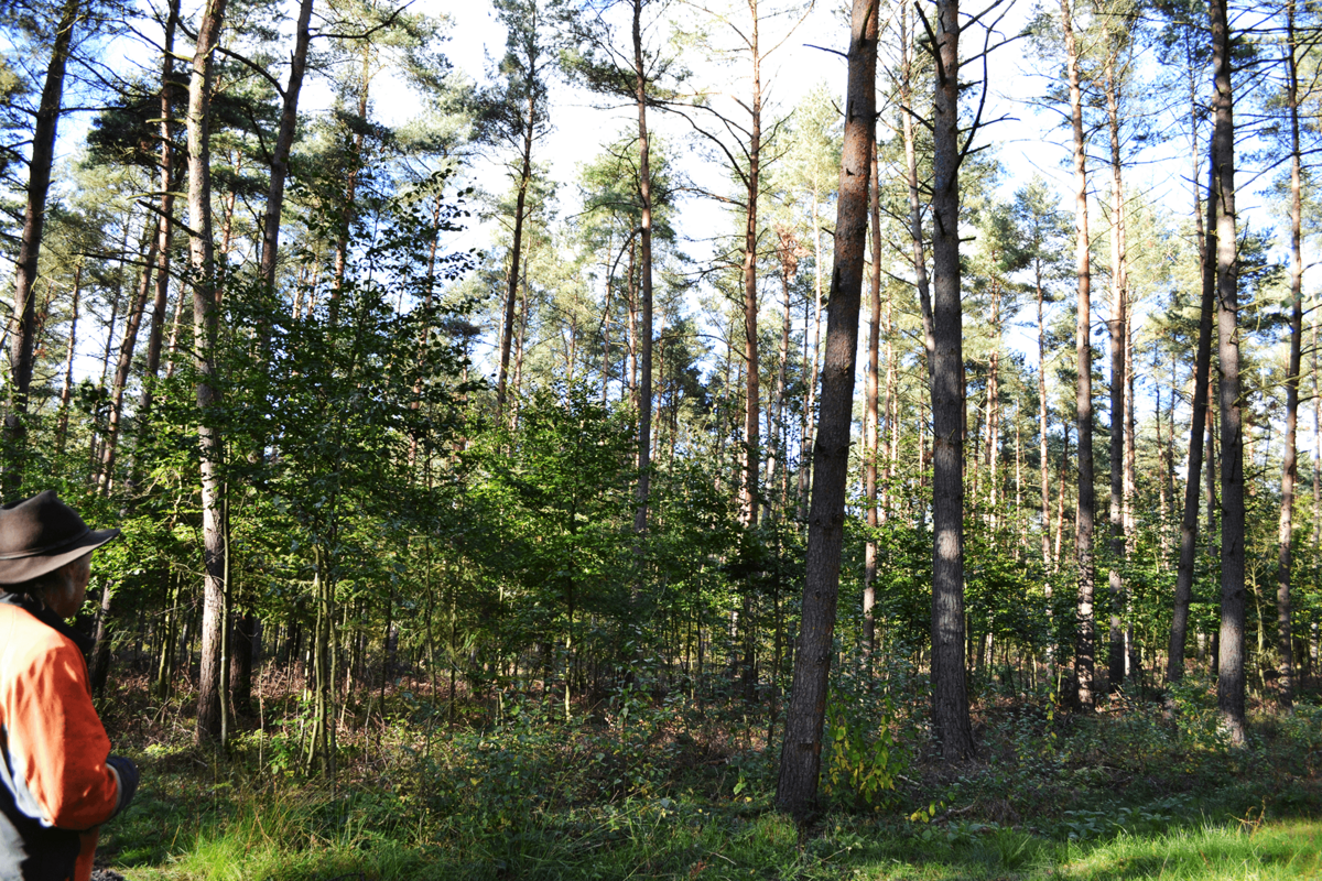 Der Aufbau des Bauckhof Waldes: Es steht eine kleine Menge an alten Bäumen, bis zu 200 Jahre alt, dann kommt der größte Teil, der mittelalte, dichtere Bewuchs. In der dritten Schicht stehen die jungen Bäume von bis zu 30 Jahren. Durch die drei Ebenen und die verschiedenen Baumarten wird eine gute Licht- und Schattenausnutzung erreicht, die nicht nur den Bäumen zugutekommt. Durch die gesteigerte Vielfalt an Baumarten erhöht sich der Artenreichtum und somit auch die Bodenfruchtbarkeit. Davon profitieren Vögel, Insekten, Waldtiere und erholungssuchende Menschen. Bei der Aufforstung in den Flächen achtet Jörg Hüsemann auf eine Ausgewogenheit zum alten Bestand. Auf einigen kleineren Flächen experimentiert er in der Aufforstung zum Beispiel mit Kirsche oder Esskastanie.