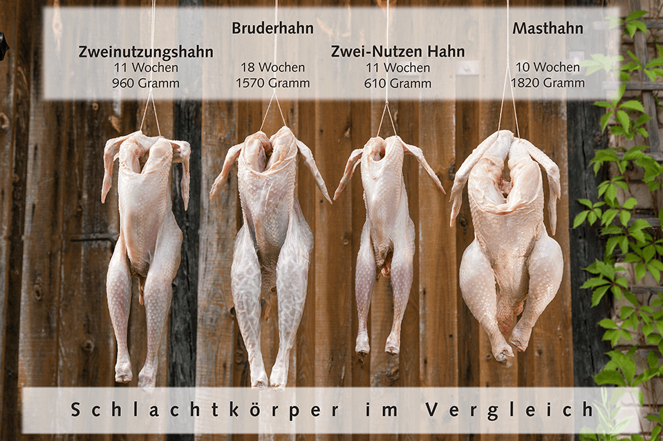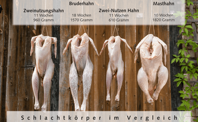 Der Zweinutzungshahn und der Bruderhahn machen vom Körperbau beide einen harmonischen, ausgewogenen Eindruck. Am Beispiel des Masthahns und des Zwei- Nutzen- Hahns kann man gut erkennen, wie sich die Zuchtrichtungen in die spezialisierten Sparten Mast- und Legezucht aufgesplittet haben. Der abgebildetete Masthahn ist eine langsam wachsende Zuchtlinie (sozusagen der Bummelzug) unter den Masthühnern. Er ist das derzeit am häufigsten verkaufte/gekaufte Bio-Geflügelprodukt in Deutschland.