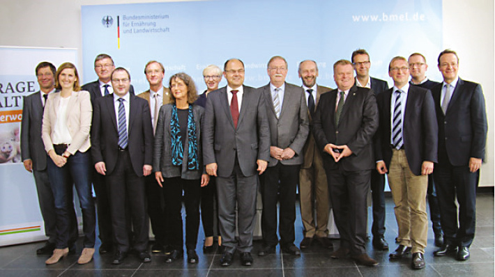 Foto: Bundesminister Christian Schmidt mit dem Vorsitzenden Gert Lindemann und den Mitgliedern des Kompetenzkreises Tierwohl am Tag der konstituierenden Sitzung im BMEL Berlin, v.l.n.r. Prof. Dr. Peter Kunzmann, Theresa Ungru, Dr. Ludwig Diekmann, Roger Fechler, Dr. Clemens Dirscherl, Prof. Dr. Ute Knierim, Inge Böhne, Bundesminister Christian Schmidt, Gert Lindemann (Vorsitzender, Min. a. D.), Prof. Rudolf Preisinger, Thomas Schröder, Prof. Dr. Achim Spiller, Dr. Jörg Bauer, Carsten Bauck, Prof. Dr. Folkhard Isermeyer. Es fehlen Jutta Jaksche, Dr. Hermann-Josef Nienhoff, Franz-Martin Rausch. Quelle BMEL