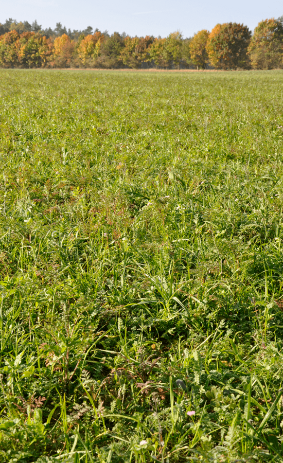 „Die Zwischenfrüchte sorgen für ausreichend Nährstoffe und eine gute Bodenstruktur. Daher versuche ich immer, Mischungen anzubauen. Eine diverse Pflanzenmischung bietet viele Vorteile: unterschiedliche Höhenstufen, Blattformen und Pflanzenstrukturen. So entwickeln sich zum Beispiel verschiedene Blüten, die für ganz unterschiedliche Insektenarten nützlich sind. Es ist die Vielfalt, die es macht! Das gilt übrigens auch für das Wurzelsystem. Pfahlwurzler wie der Ölrettich rammen richtige Löcher in den Boden. Leguminosen wie Erbsen binden mit ihren Knöllchenbakterien Stickstoff. Dazu kommen noch Pflanzen, die büschelige Wurzeln mit hohem Feinwurzelanteil ausbilden wie verschiedene Gräser. Das bedeutet: Unterschiedliche Pflanzen dringen mit ihren Wurzeln mal mehr, mal weniger tief in den Erdboden ein und sorgen so für eine Auflockerung aller Bodenschichten. Deswegen setzen wir beim Bauckhof auf Biodiversität und Fruchtfolgen.“