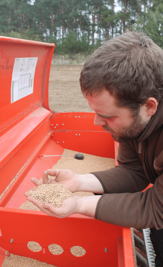 Eine Untersaat reguliert das Unkraut, versorgt den Boden mit Stickstoff und kann – je nach Einsatz – den Boden beschatten, nachdem die Hauptfrucht abgeerntet ist. „Kurz bevor die Kartoffeln blühen, säen wir Lupine, 100 Kilogramm Saatgut pro Hektar. Wenn im Sommer die Kartoffeln von Krautfäule befallen werden und absterben, kommt die Lupine ins Spiel. Ihre Saat ist recht groß und rollt von den Dämmen in die Furchen zwischen den Kartoffeln. Mit ihren Wurzeln hält die Lupine unsere leichten Heideböden. Dazu verbessert sie deren Struktur, schützt sie vor Erosionen und lagert Stickstoff für die Folgekultur ein. Bei uns der Winterroggen.“