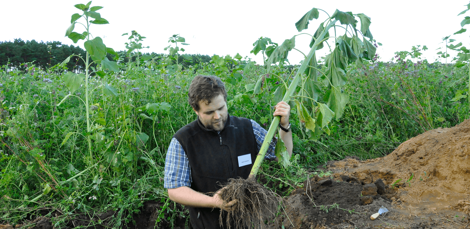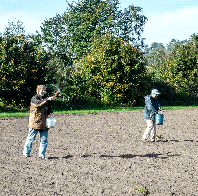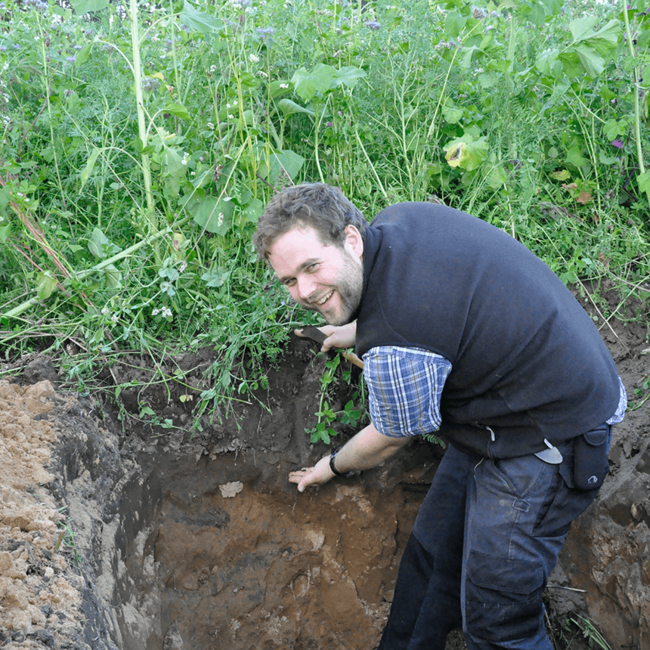 Der Boden gehört zu den wichtigsten, nicht vermehrbaren Ressourcen. Deshalb steht er in der biologisch-dynamischen Landwirtschaft im Mittelpunkt aller Bemühungen. Die Böden in Stütensen sind sehr sandig und enthalten wenig Humus. „Nur die oberen etwa 25 Zentimeter sind fruchtbar. Wir haben hier auf dem Acker eine Parabraunerde. Die leicht tonhaltige Schicht in 30 Zentimeter Tiefe ist verdichtet“, erklärt Jakob Schererz die Strukturen, die sich in Platten übereinander schichten.
