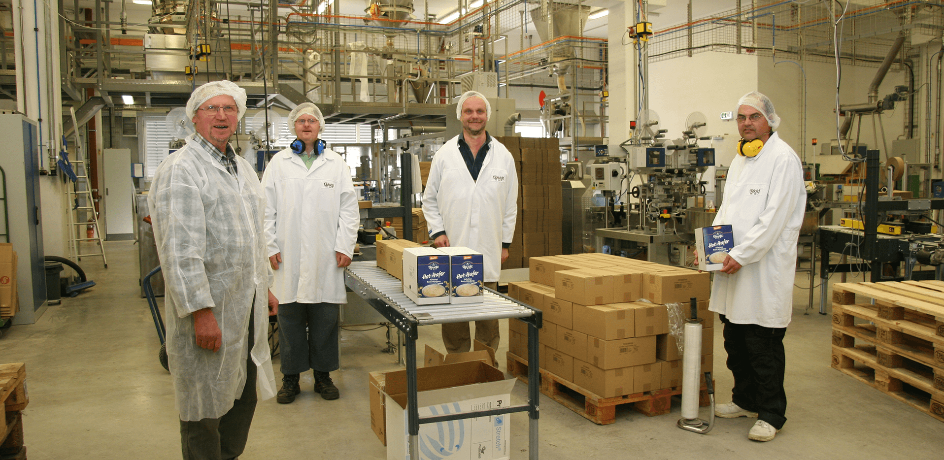 „Die Kollegen vom Bauckhof Stütensen sind für uns eine Bereicherung und eine tolle Unterstützung“, so Dennis Mittelstädt, Schichtführer bei Bauckhof Naturkost und Wilfried Pauch, stellvertretender Produktionsleiter. „Und sorgen auch immer wieder für Spaß bei der Arbeit.“ Christian, Michi und Jürgen gehören zu der fünfköpfigen Gruppe, die vormittags in Rosche in der Produktion arbeitet. Ihre Aufgaben sind vielfältig, überall wo Handarbeit gefragt ist, kommen sie zum Einsatz. „Wir packen Zutaten in die Kartons wie Zitronenöl für den Zitronenkuchen“, sagt Jürgen. Das Stütenser Team füllt auch Sojamehl per Hand ab, das wird aufgrund der kleinen Mengen nicht maschinell erledigt. „Unser Team kann auch mal für zwei bis drei Stunden Arbeitskräfte vertreten“, berichtet Johann Müller, der als Betreuer die Stütenser begleitet. „Häufig sind die Menschen mit Behinderungen außen vor, am Rande der Gesellschaft. Hier bei Bauckhof Naturkost wird Inklusion wirklich gelebt.“