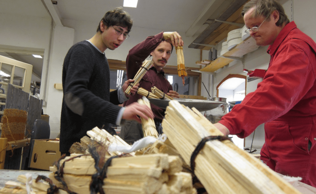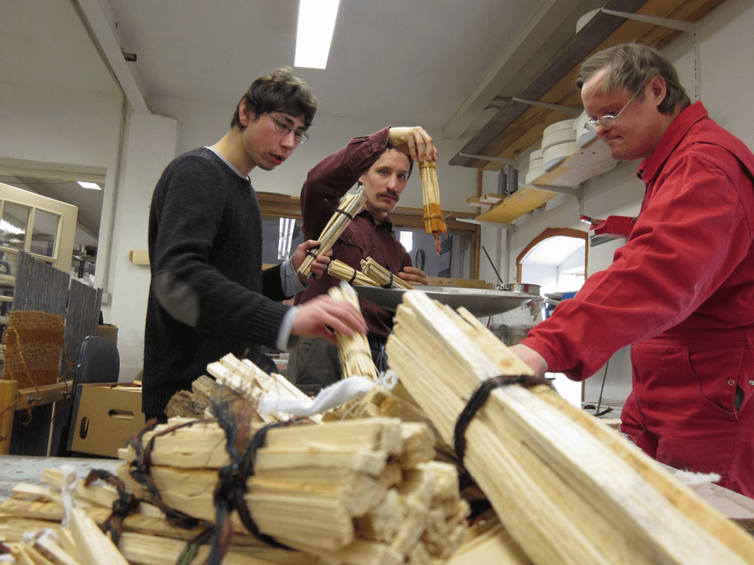 In der Werkstatt werden zum Beispiel auch gewebte Sitzauflagen und Fußmatten gefertigt. Besonders beliebt in der Heizsaison sind unsere mit Wachs getränkten Feueranzünder. Das Wachs wird aus Kerzenresten geschmolzen und so sinnvoll wiederverwertet.